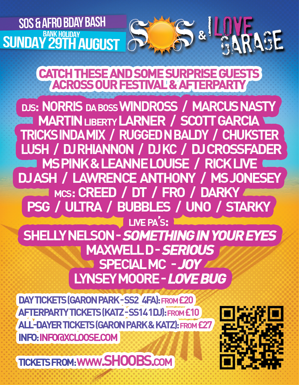 BE SURE TO CHOOSE THE CORRECT TICKET TYPE SOS & I Love Garage present SOS Super Sunday on Bank Holiday Saturday 29th Aug 2021 @ Garon Park - Southend, Essex SS2 4FA We kick off with the festi...