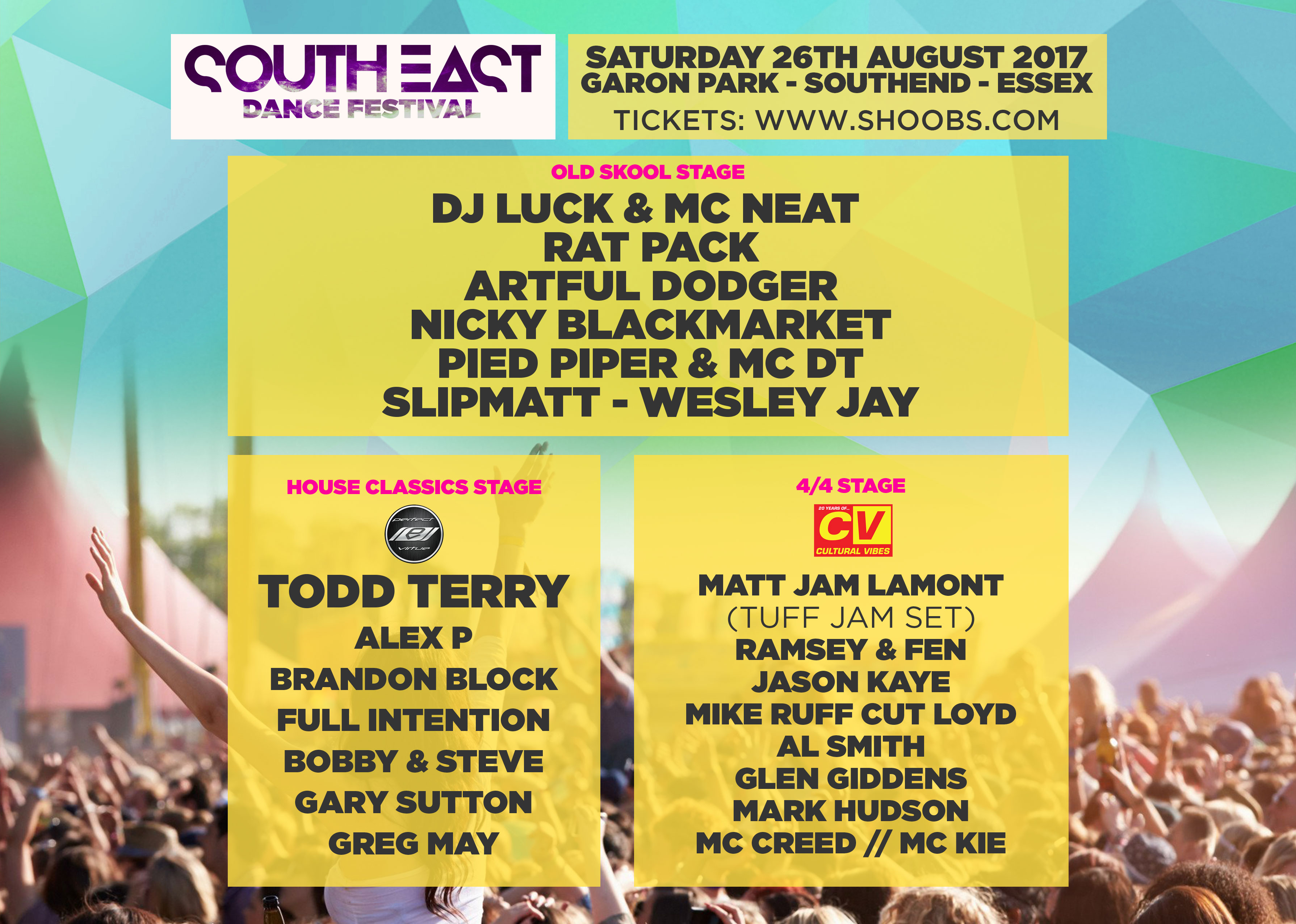 South East Dance Festival Bank Holiday Saturday 26th Aug 2017 @ Garon Park - Southend, Essex SS2 4FA ----------------------------------------------------- Main Stage: UK Garage & Old Skool ...